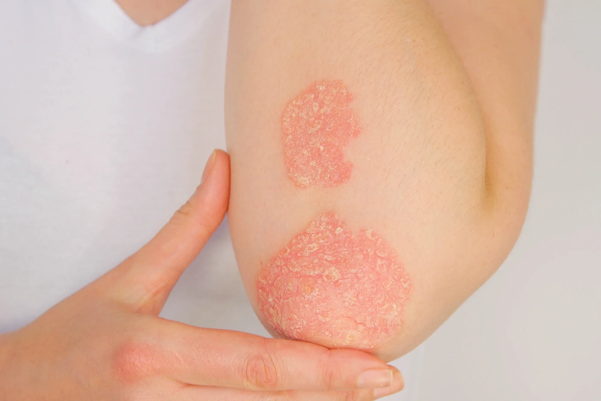 Die Psoriasis wird verursacht durch eine genetisch bedingte, fehlerhafte Abwehrreaktion des Körpers. In der Folge kommt es zu Entzündungsprozessen vornehmlich in der Haut, in selteneren Fällen aber auch im ganzen Körper. Ein gestörter Erneuerungsprozess der Haut führt zu den typischen Symptomen wie Hautrötungen, Schuppen und Juckreiz. Besonders häufig tritt die Psoriasis am behaarten Kopf, dem Ellenbogen, dem Knie und dem Gesäß auf.